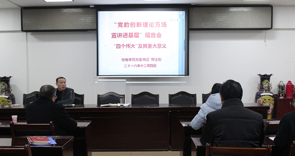 为引导广大党员深化学习习近平新时代中国特色社会主义思想,扎实推动党的创新理论成果深入人心,把党的十九大精神落到实处,12月4日,物电学院在理科楼511会议室举行“党的创新理论万场宣讲进基层”专题报告会,公司党委书记柳士刚为公司全体师生党员作了题目为《“四个伟大”及其重大意义》的专题报告。