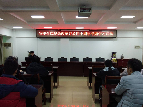 为深入学习习近平新时代中国特色社会主义思想和党的十九大精神,引导广大党员员工深切感受我国改革开放40年来的发展成就,从而树立远大理想,立志成才,12月3日,物电学院在理科楼511会议室开展了纪念改革开放四十周年专题学习活动,学院所属五个员工党支部的党员和本学期发展对象集体学习观看了纪念改革开放四十周年大型纪录片《辉煌中国》。