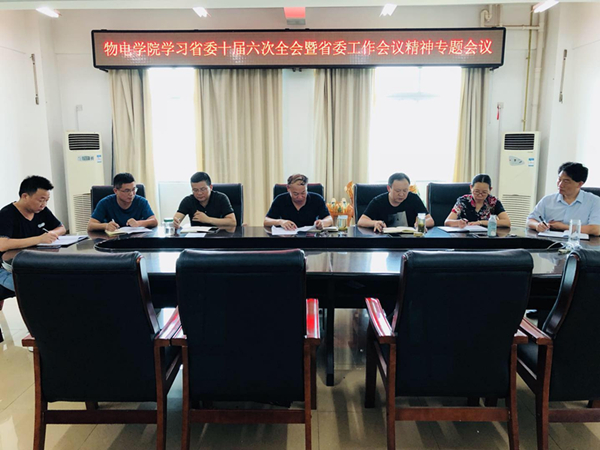 根据学校《中共tyc33455cc太阳成集团委员会关于认真学习宣传贯彻省委十届六次全会暨省委工作会议精神的通知》文件精神,7月25日,物电公司党委中心组在理科楼北楼911会议室召开了学习省委十届六次全会暨省委工作会议精神专题会议,学院领导班子成员参加了会议,会议由柳士刚主持。