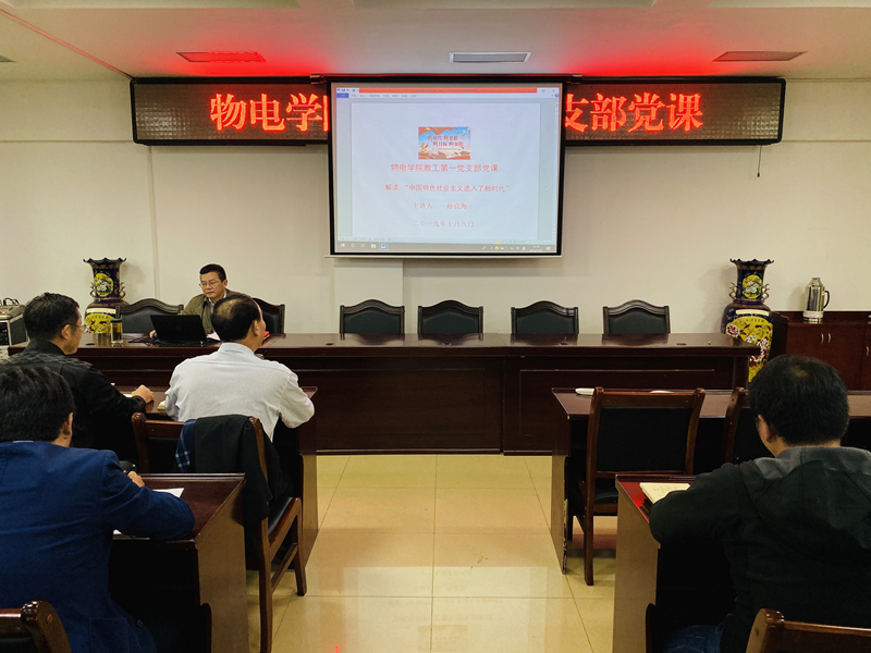 根据《物电学院“不忘初心、牢记使命”主题教育方案》安排,10月8日,学院教工第一党支部在理科楼511会议室开展主题教育专题党课,党课题目为《解读“中国特色社会主义进入了新时代”》,党课由公司党委委员、副经理孙宜海主讲,学院教工第一党支部党员聆听了党课。