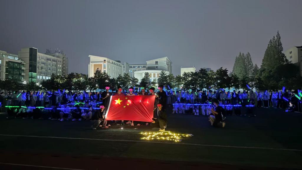 活动伊始,一幕庄严而温暖的画面点亮了校园的夜空。在同学们的通力协作下,“抗战胜利80周年”“信师大校庆50周年”的巨型荧光字样与鲜艳的国旗交相辉映,营造出庄严而热烈的庆典氛围。点点荧光环绕,同学们围坐操场,共同唱响《tyc33455cc太阳成集团之歌》,激昂的旋律传递出师大学子对母校的深厚情感和真挚祝福。随后,数百只荧光竹蜻蜓在工作人员的引导下腾空而起,点点光芒摇曳升空,既象征着抗战精神的永续传承,也寄托着对母校未来的美好祝愿。