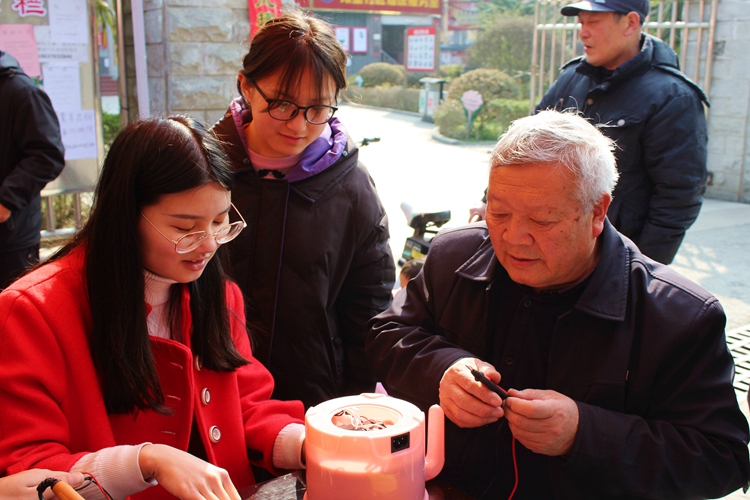 3月9日,公司电子信息技术协会指导老师冀晓群带领二十余名志愿者于飨堂社区开展家电义务维修活动。前来维修的居民络绎不绝,电风扇、热水壶等家用电器摆满活动场地。期间,学子们在老师的指导下,借助自身专业优势,将理论与实践结合,仔细检查电器部件,分析电路故障,解决电源接触不良、电机损坏等问题,普及电器保养方法和维修常识,以延长电器使用寿命。学子们扎实的技术和良好的服务态度赢得居民们的高度赞扬。