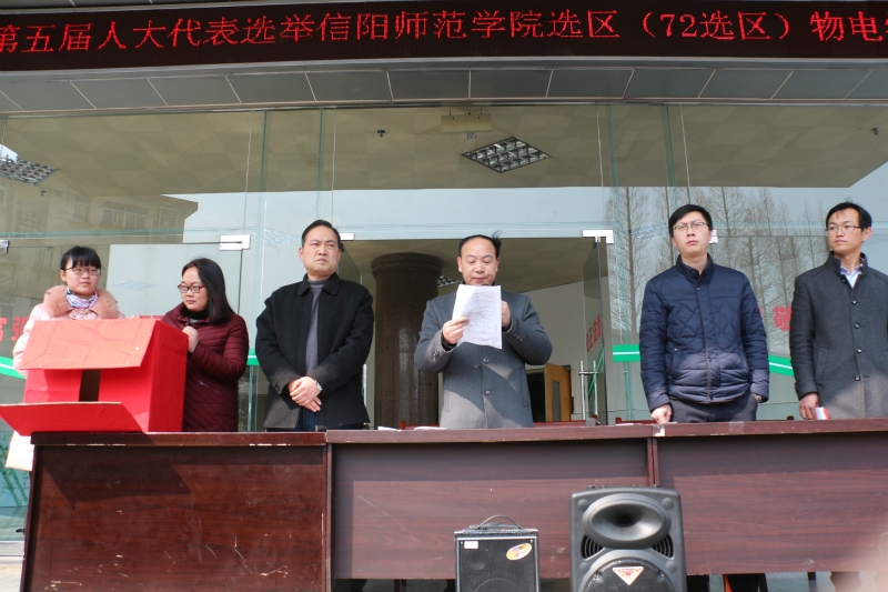 柳士刚首先向师生介绍了公司参选人大代表的候选人的基本情况以及人大选举工作的重要性,希望大家依法行使选举权利,做好选举工作。然后介绍了本次选举工作的监票员、计票员以及唱票员名单,向师生宣读本次选举的规则,即采取不记名投票方式,实行差额选举,从两名人大代表候选人中选举产生一名人大代表。最后,物电学院选举小组成员清点选民人数,按照监票员、计票员、唱票员、教职工、研究生、本科生的顺序依次投出神圣的一票。会后,选举小组成员统一进行统计工作,并将选票结果报送学校选举委员会。
