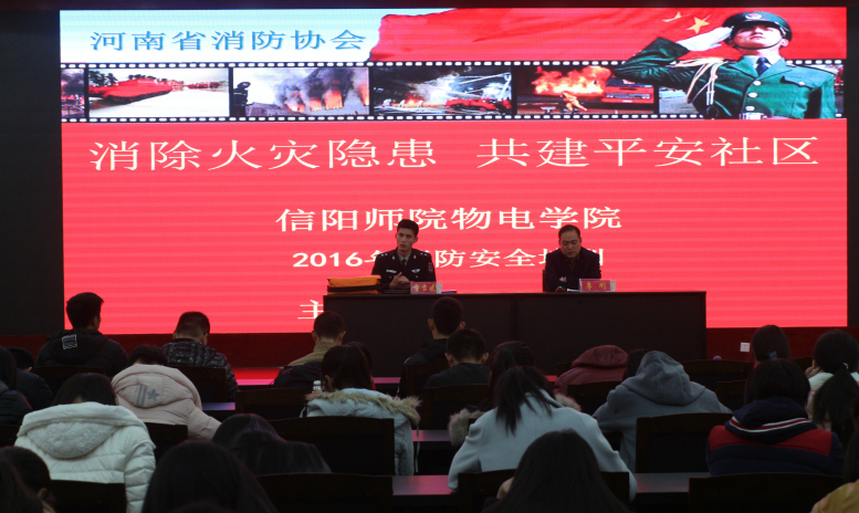 为增强员工消防意识,消除火灾隐患,共建平安校园,11月21日晚,物电学院新生入学教育之消防安全知识培训在艺术楼会议厅召开。公司特邀河南省消防协会专职教员贾雪建担任主讲人,党委副书记李刚,辅导员张彦飞,张康华,杨勇,黄钰莹及16级全体员工参加了本次大会,会议由李刚主持。