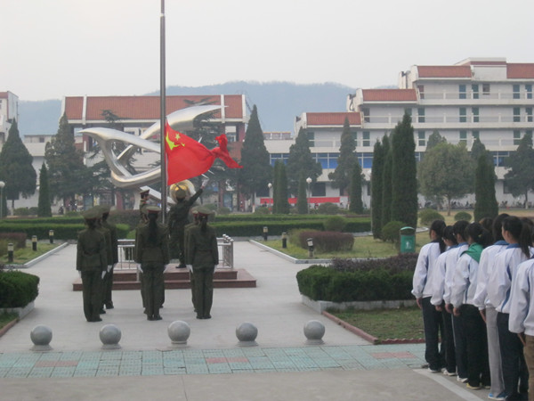 6:20在相关员工干部的组织下,11级学子统一身着校服,按照班级顺序,在国旗台前集合完毕。6: