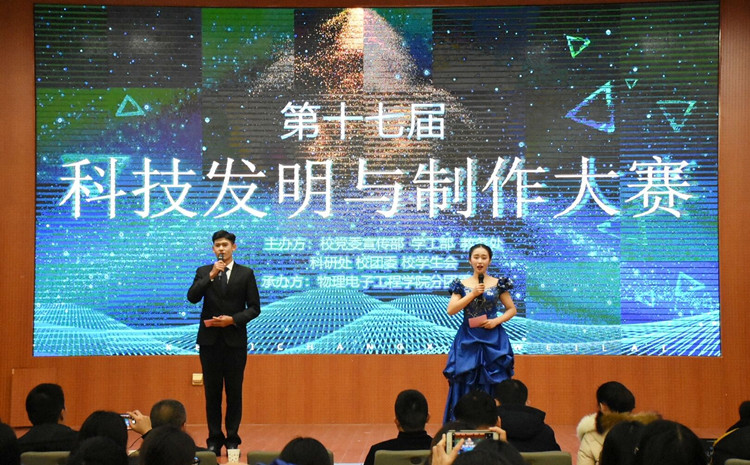 闪耀科技之光,彰显校园活力。12月15日晚,由公司党委宣传部、学工部、教务处、科研处、校团委、校员工会主办,公司分团委、电子信息技术协会承办的第十七届老员工科技文化艺术节暨科技发明与制作大赛于逸夫楼多功能厅隆重召开。本届比赛由物电学院团委老师黄钰莹带领部分志愿者及科技制作爱好者具体组织安排,校团委老师赵广伟、张锐,物电学院老师冯一兵、余大庆、刘墨林、孙金土、赵华、陈天歌应邀出席并担任评委。