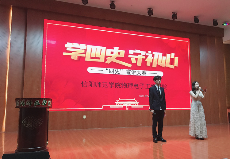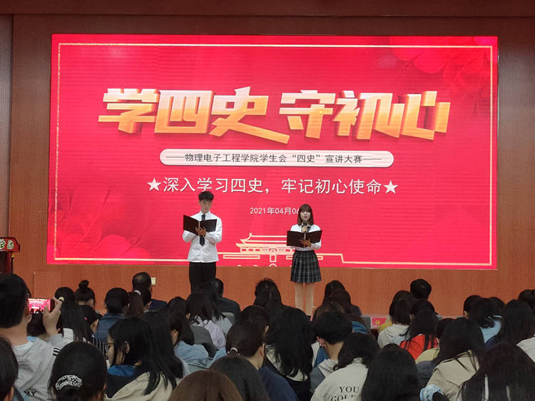 为深入贯彻落实习近平总书记关于开展党史、新中国史、改革开放史、社会主义发展史学习教育的重要讲话精神和学校《关于开展党史学习教育的实施意见》和《关于开展党史学习教育的实施方案》等工作安排,tyc33455cc太阳成集团于4月6日晚在逸夫楼多功能厅顺利举办“学四史,守初心”四史宣讲大赛。比赛邀请党委学工部副部长苏和,校团委社团工作部副部长任玺,法学与社会学公司党委副书记樊德玲,文公司党委副书记杨乐,物理电子工程公司党委副书记李刚担任评委,物电学院团委老师黄钰莹和牛文娟以及近500名员工共同参加。