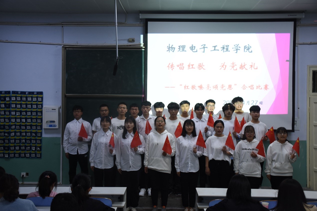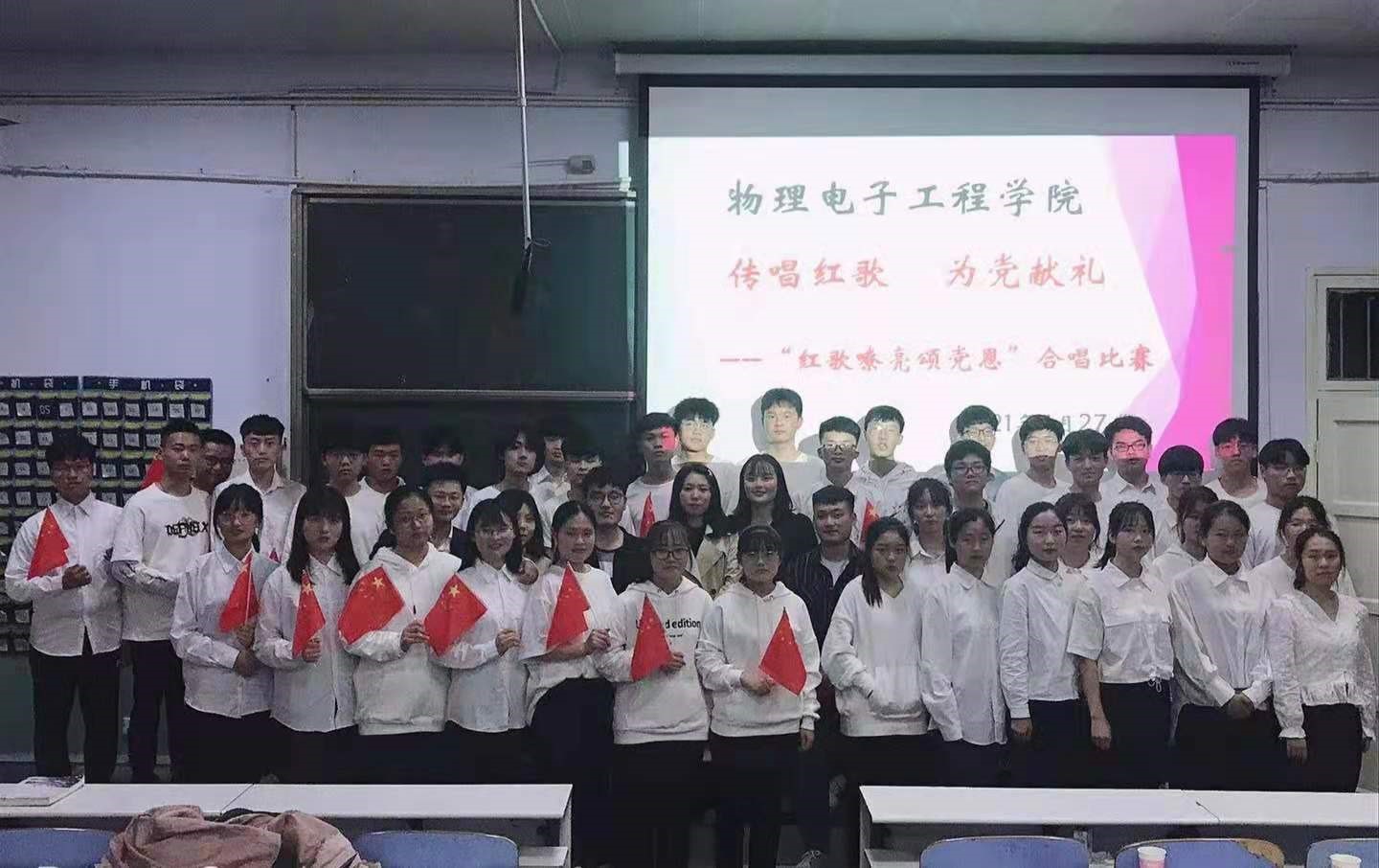 弘扬民族文化,传唱红色金曲,激发爱国热情,展现物电风采。为庆祝建党100周年,公司于2021年4月27日晚6:30在教二T1举行“传唱红歌 为党献礼”——红歌嘹亮颂党恩合唱比赛。文学院团委老师柳家琪,专职辅导员陈辉,旅游学院团委老师赵子鉴,数学与统计学院专职辅导员杨帆,化学化工学院专职辅导员严赫,物电学院团委老师牛文娟参加此次活动,并担任此次比赛评委。此次合唱比赛充分展示了公司员工对党、对祖国最真挚的爱,也展现公司学子饱满的精神面貌。