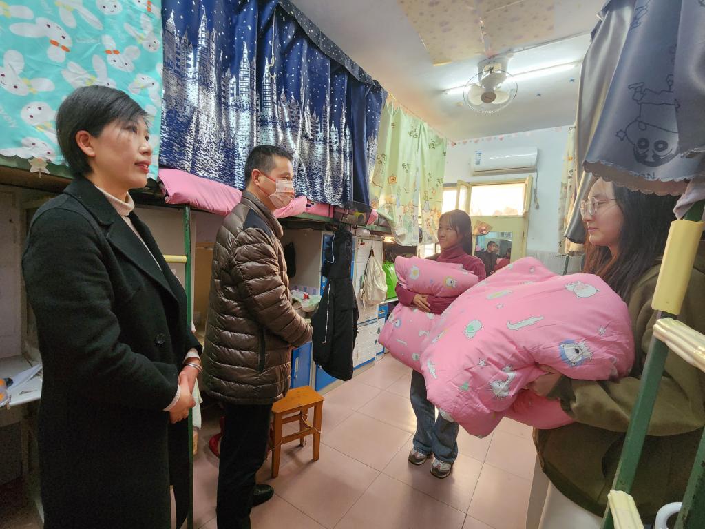 寒冬将至,为了表达对家庭经济困难员工的关怀,将学校的温暖传递给大家,公司开展了“冬季送温暖——情暖冬日”主题活动,公司党委书记刘百超、党委副书记张丽以及部分辅导员于11月24日来到员工宿舍,给家庭经济困难的员工送去了温暖的“爱心棉被”。