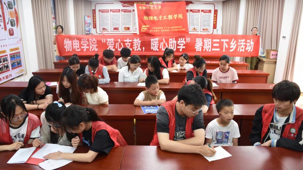 “哇,这也太神奇了吧!”、“和小哥哥一起做小手工真好玩……”炎炎夏日,信阳市飨堂社区的党群服务中心充满欢声笑语。成员们结合专业知识,通过面对面、小范围、互动式辅导,开展爱心支教实践活动。此外,爱心支教团还注重孩子们的心理健康与情感陪伴,成员们通过互动游戏、手工制作等活动,拉近与孩子们的距离,让他们在欢声笑语中感受到社会的温暖与关爱。