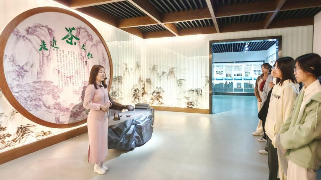 随后,同学们前往茶文化馆进行参观。讲解员详细介绍茶的分类以及制作流程,并分享相关名人故事,让员工对茶文化的历史有了更深刻的认识。展馆内还设置沏茶表演环节,表演者以优雅流畅的动作展示传统技艺,让同学们感受到茶文化的魅力。
