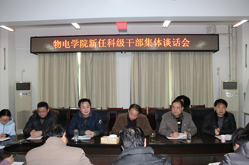 会上,柳士刚宣读了新任的科级干部名单。柳士刚介绍了本次物电学院科级干部调整的指导思想及原则要求。随后,柳士刚结合学院的工作实际及特点向大家提出了殷切期望和要求:一是要摆正角色,想干事、会干事、干成事。培养转变工作能力,要有学习的能力,要有执行能力,要具备管理能力和创新能力。二是希望大家要珍惜岗位和机会,常怀感恩之心。三是要有担当精神,增强责任意识。四是要脚踏实地,奋发有力,锐意进取。五是要廉洁自律,加强作风建设。罗永松结合教研室工作向新任教研室主任提出了明确要求:一要做好角色转变,适应管理岗位工作需要;二要做好本职业务工作,提高业务水平和能力;三要加强思想政治学习,增强理论武装;四要重新认识教研室主任工作,在教研室发挥好模范带头作用。大家纷纷表示要认真学习,努力工作,认真履行岗位职责,不辜负组织期望,为学院快速发展贡献力量。