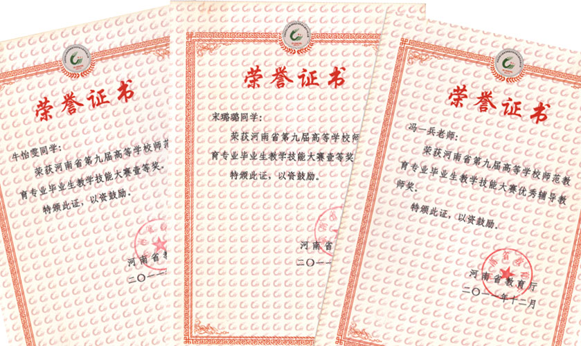 近日,河南省教育厅公布了《河南省第九届高等学校师范教育专业毕业生教学技能大赛结果》,并颁发了获奖证书。公司选派的两名2008级物理学专业员工牛怡雯、宋璐璐双双获得一等奖,指导教师冯一兵获优秀辅导教师奖。