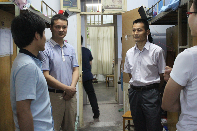 苗天峰一行走访了学院近60间员工宿舍,重点视察了同学们的住宿卫生及宿舍安全状况,提醒同学们酷夏来临,天气炎热异常,学校进入用电高峰期,尤其要注意宿舍用电安全,要规范用电,宿舍无人时,插线板等物品一定要断电。