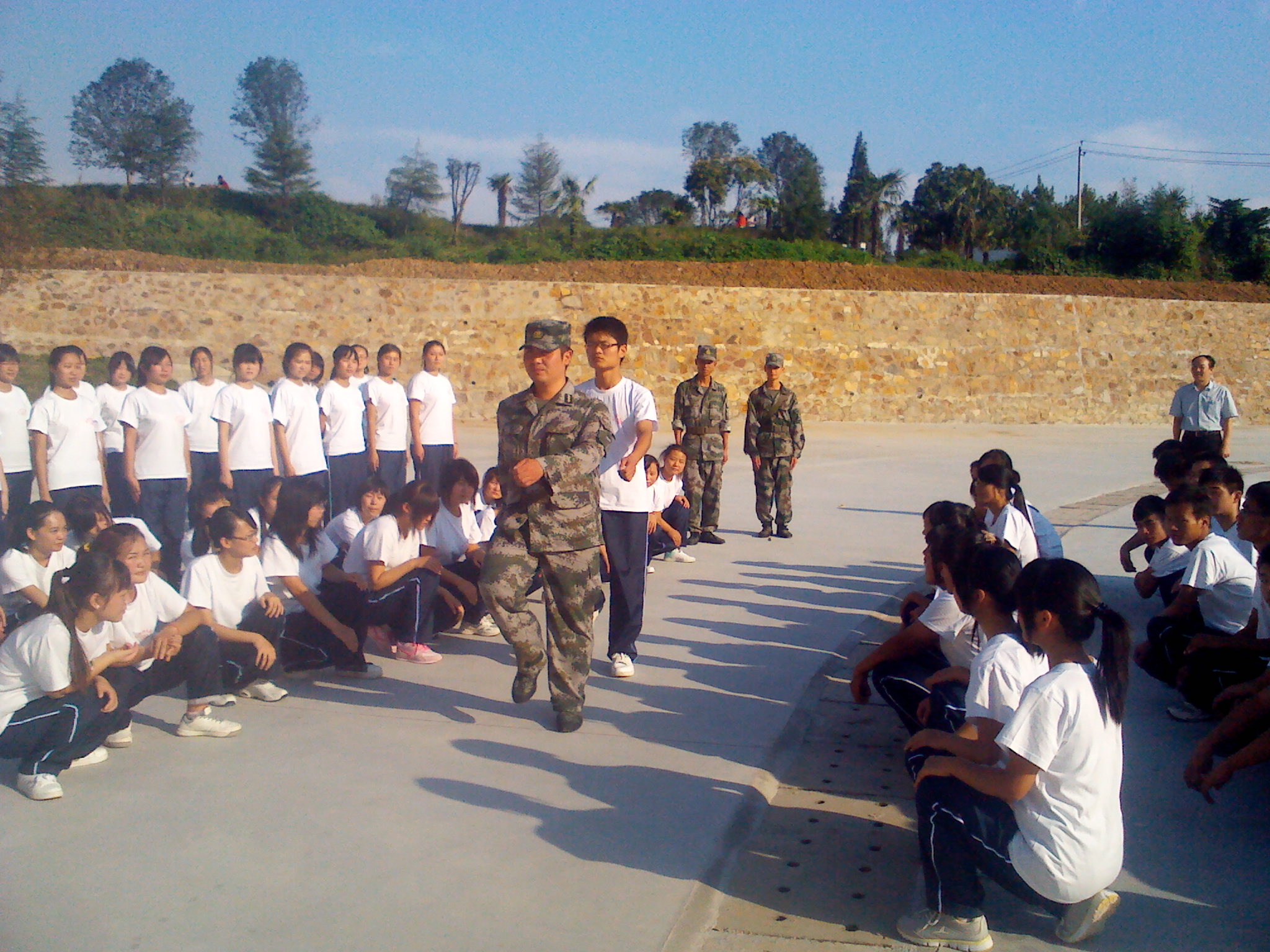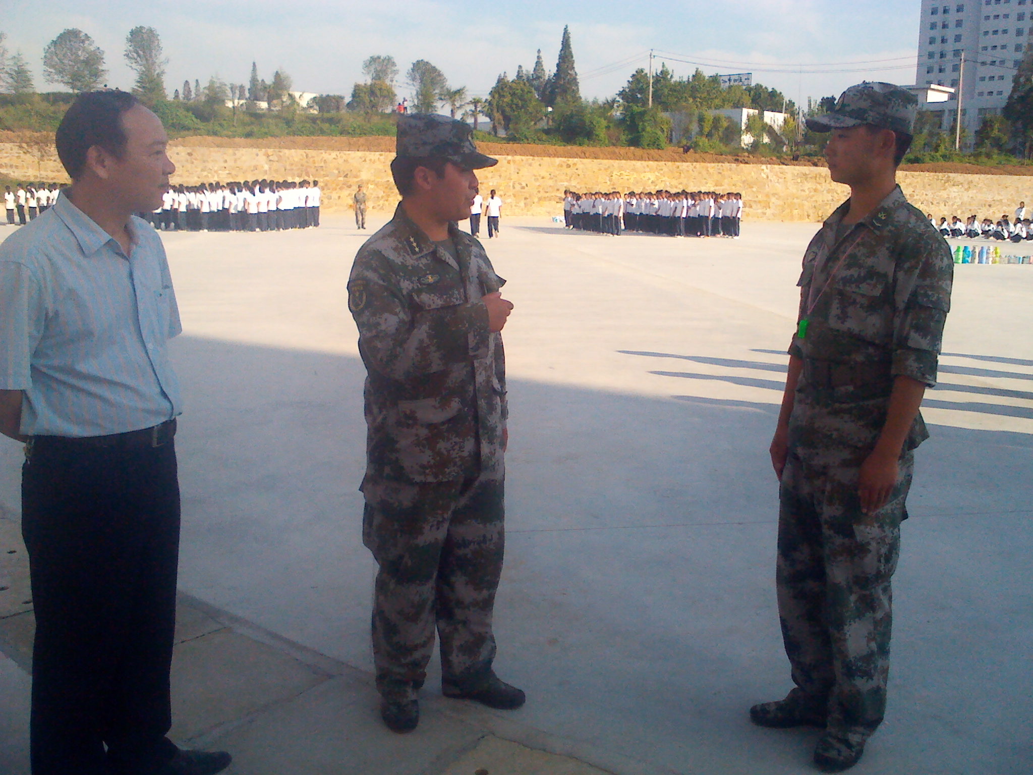 柳士刚等一行来到物电学院新生军训现场,首先,从新生的精神风貌、动作标准程度等几个方面考察了新生的训练情况。在视察的过程中,柳处长和教官们进行亲切交谈,了解新生训练的相关安排,同大一新生进行亲切交流,了解他们对军训的真实感受和需求。最后,柳处长对大一新生提出了军训的具体要求,他说:军训是励练自身品质、提高国防意识的机会;是不断增强集体主义和爱国主义观念,立志成才,适应老员工活的一个开端。他希望大一新生在这短短10天的训练中,同学们要发扬吃苦耐劳的精神,磨练自己的意志,保质保量的完成军训任务。部队首长还亲自为公司新生示范相关动作,并对教官和新生提出了严格的要求。