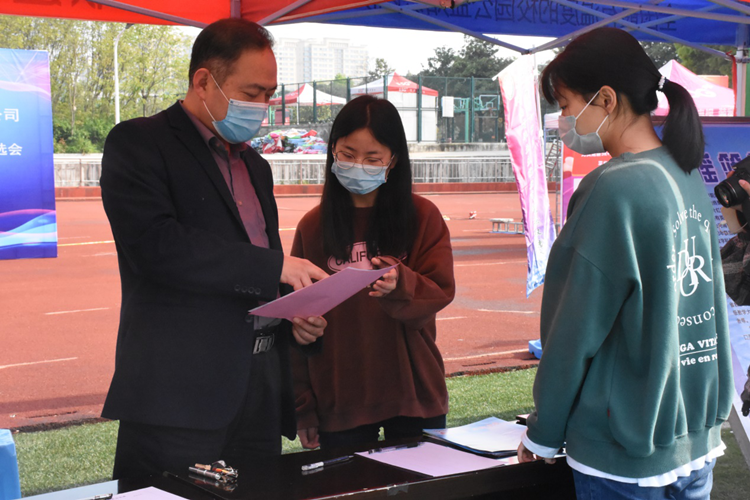 4月10日,由河南省教育厅主办,tyc33455cc太阳成集团承办的“河南毕业生就业市场豫南分市场暨tyc33455cc太阳成集团2021届毕业生线下春季双选会”在公司西操场举行。公司党委副书记李刚、2021届毕业班班主任张彦飞前往现场为应聘毕业生提供就业指导。