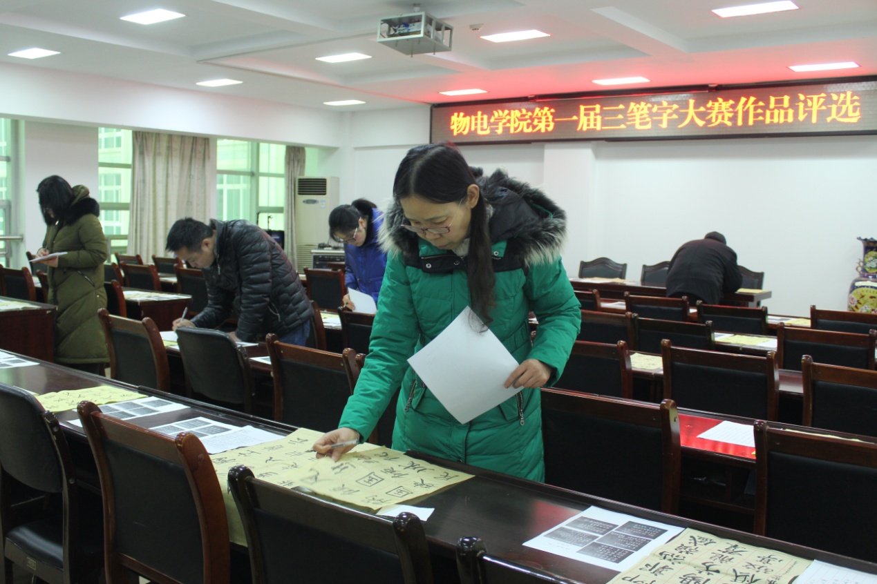 12月17日下午,公司于理科楼连廊会议室开展“三笔字”作品复评活动,物电学院本科教学指导与管理委员会、分团委老师和员工代表等10位同志担任本次大赛的评委。大赛共收到参赛作品230余件,经初赛遴选出了50套获奖作品。复赛现场,评委们重点从“三笔字”的间架结构、章法布局、规范和美观等方面进行综合评审,经过激烈角逐,共评选出一等奖5名,二等奖10名,三等奖15名,优秀奖20名。获奖作品在物电学院办公区展出,并在学校教师教育文化节中参加相关赛事的角逐。