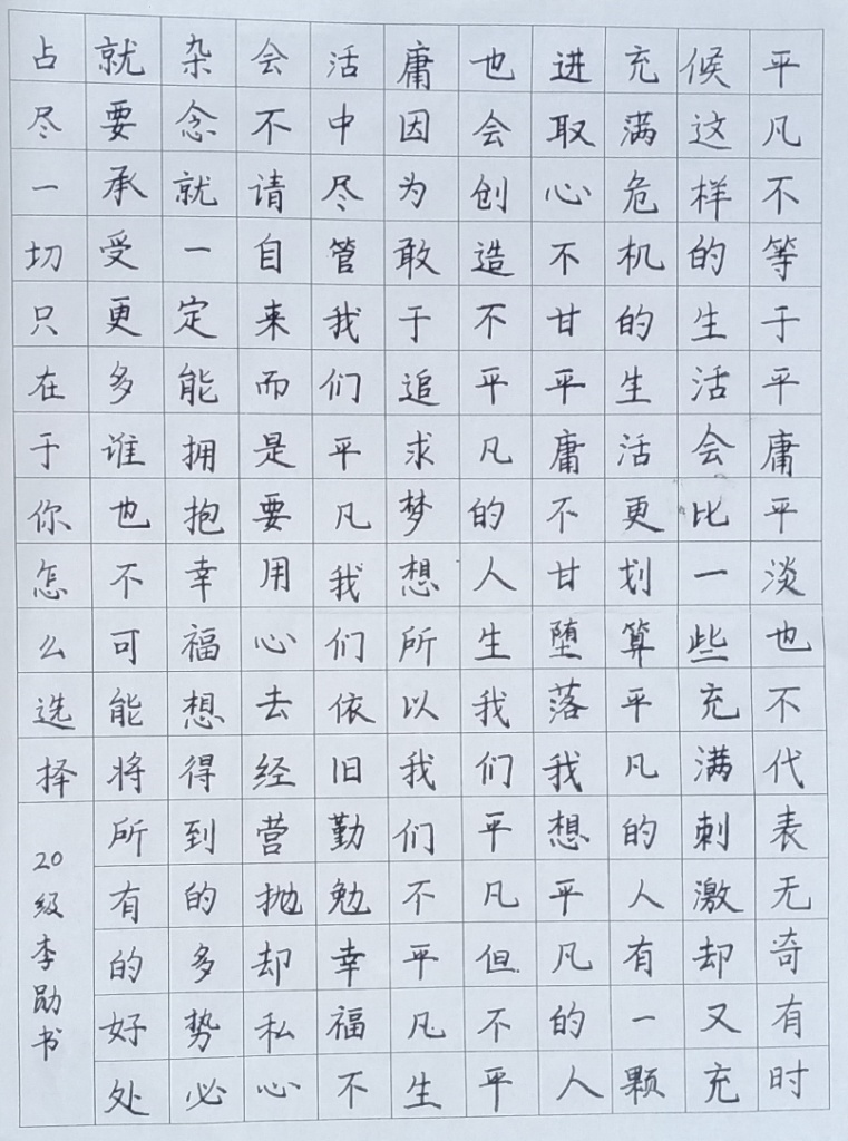 本次活动自11月初启动以来,以“笔尖风华肆意绽放”为主题,主要分为粉笔、钢笔、毛笔三项比赛,包含投稿、初评、复评、颁奖等四个环节,以2018级物理学专业员工为主要参赛对象,其他年级和专业员工自愿参加。学院以宿舍为单位为师范生免费配备了小黑板、字帖、练字纸、墨汁、毛笔、粉笔等材料,以赛带练,推动全院员工自主进行“三笔字”书写训练,引导员工把写好汉字、每天练字作为一种日常化的行为。