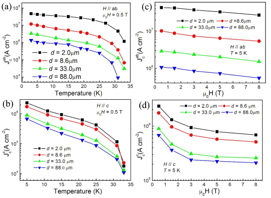 图2. 在不同的温度和磁场条件下,样品的临界电流密度随着沿晶体c轴厚度的